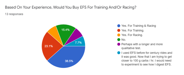 Overall, five of 13 testers indicated they would use EFS for racing and training, three said they would use it only for training, and one only for racing. Two testers said they would not use it for either. And then two testers were undecided and felt they needed to do more testing to see if it would work well for longer sessions more akin to a race.