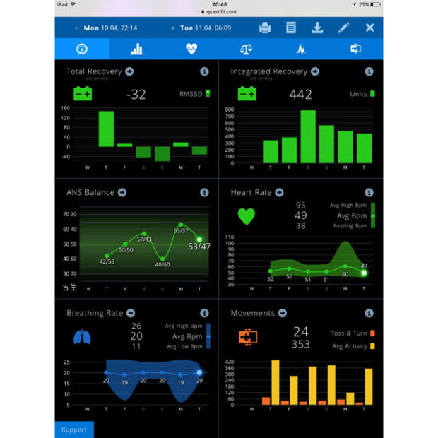 The EMFIT QS measures full night HRV, heart rate and breathing rate, movement during sleep, along with some derivative metrics such as phases of sleep, autonomic nervous system balance, sleep score, and HRV recovery. The EMFIT operating system lets users analyze the various metrics via their web interface in several data increments including: 7, 14, 30, 60, and 90 days, or custom ranges.