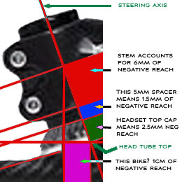 Fitters typically remember to subtract from the stack the 1.5cm of spacers they have to make room for. What they forget is that you must add the following to the reach: .31 x (half the stem clamp + headset top cap + spacers).