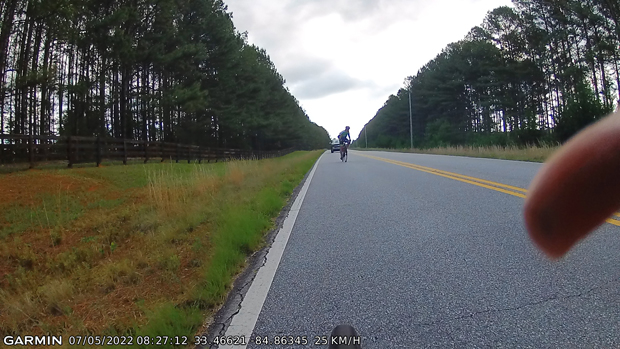 The video and photo quality are good. The resolution of both is 1920×1080, which is higher than we post on the Slowtwitch site, so these photos and videos give you a sense of the full quality. This photo gives a look back at another rider as a car is approaching. What is subtle here is that he is looking back. Do you know who never looked back? Me, because the radar told me the car was back there and I clicked the photo button to save the picture for this review.