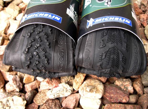 The typical tire choice among fast folks is a low-to-intermediate tread cyclocross tire. These won’t suck up too much energy on pavement, while still offering reasonable control in the muddy stuff.