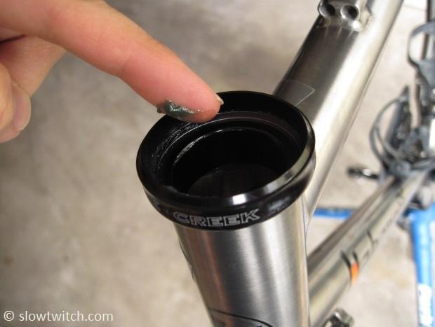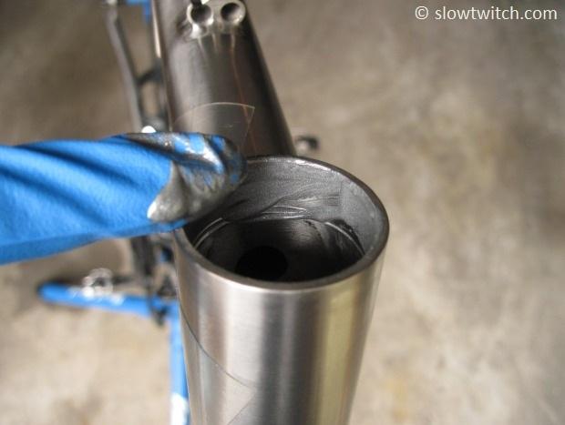 Now it’s time to apply new anti-seize (or grease on a non-titanium frame). Be sure to get the inside of the head tube AND the ends, or faces of the tube.