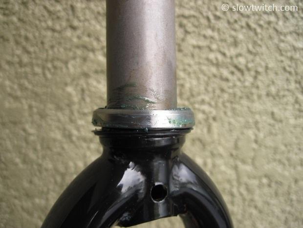 Now we need to repeat the procedure for the bottom bearing. Smudge the whole thing in grease, and put it on the fork steerer. It should face the opposite direction of the top bearing – angled side up, flat side down.