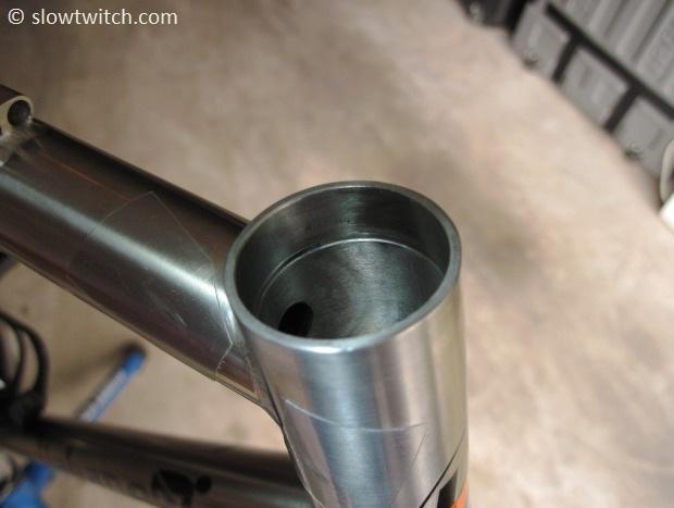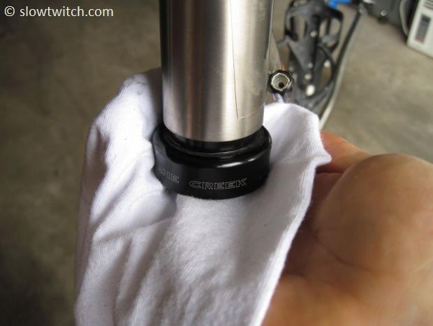 Now, do what every good mechanic does and completely wipe out the head tube. It will likely have some nasty old grease and dirt… so take 30 seconds and clean it well.