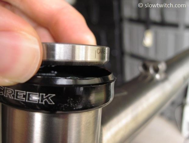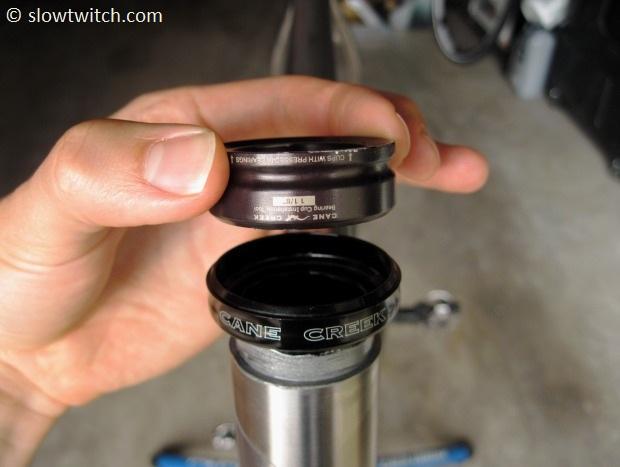 Next drop the top bearing in – angled side down, flat side up. Keep in mind that not all headsets have identical top and bottom bearings. Pay attention if and when you remove them, so you know which is which.