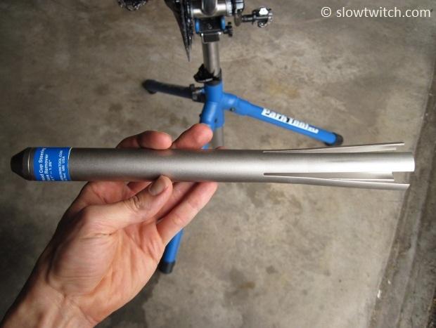 You can remove either the bottom or top headset cup first; it doesn’t matter. The tool works just like it looks – you force it in one end of the head tube, it expands, and you hammer the cups out.