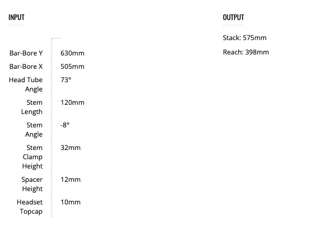 How do we know if Hölger got it right? Yes, the Deda stem is compatible with this bike and yes it does come in that angle. Above is a screenshot of the output when the front end values Hölger spec’d are plunked into the text boxes. (This is from the hx/hy calculator we host here on Slowtwitch.) So far, so good.