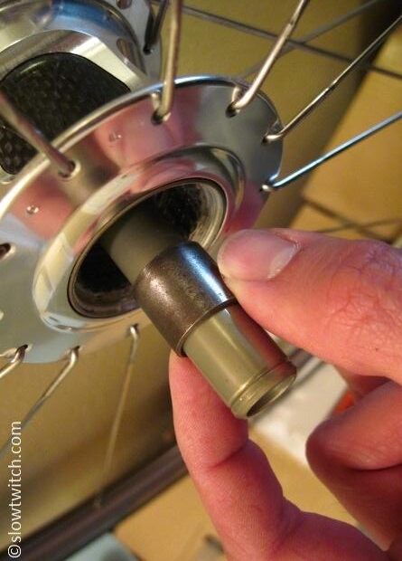 Now is a good time to spin the axle itself. If the hub bearings feel rough, you must send the hub back to CycleOps for new bearings. With most other hubs, you can replace the bearings at home, provided you have your own bearing press.