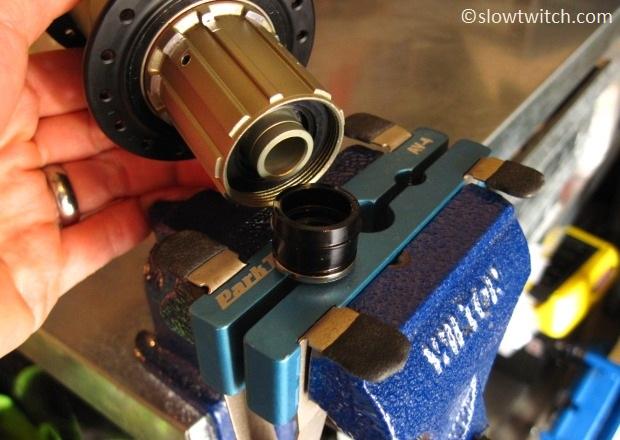 CycleOps received feedback that some customers didn’t like the ease with which the freehub comes off (which I don’t quite understand), so they reduced the clearance between the end cap and axle on the G3. You may be able to pull the freehub off with your hand, but I was unable to. I used my trusty axle vice: