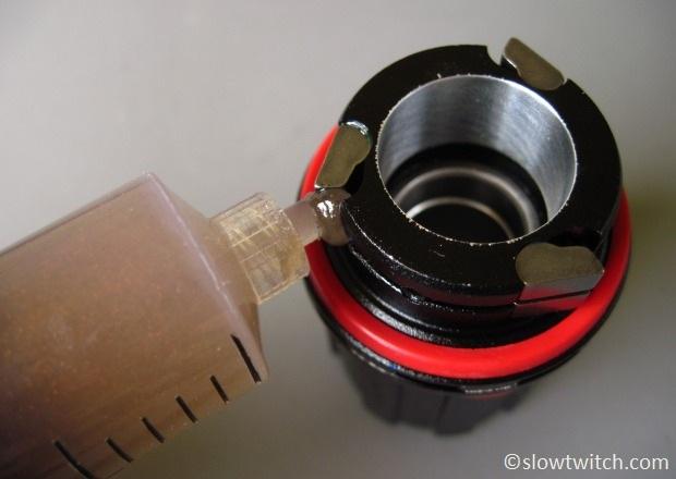 It is thick enough to last a long time, but thin enough to not gum up the pawls. I put one ‘large drop’ on each pawl and spread it around. I also put a light layer on the hub’s ratchet ring.