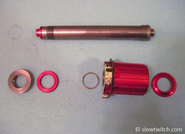 Next, slide the (greased) axle back in the freehub. Don’t forget to re-use your .25mm shim!