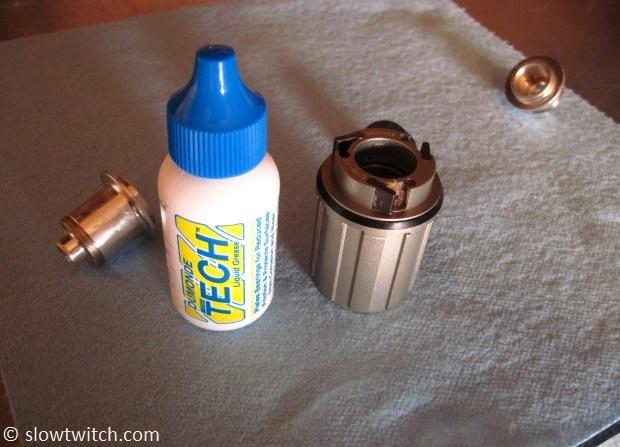 Next I did the ‘basic’ service mentioned previously: Wipe off the drive mechanism and re-lube it. This particular hub had springs that felt middle-of-the-road in terms of strength. Stronger springs can handle grease (which lasts a long time), but have a little bit more drag when coasting. Light springs require that you use oil, which doesn’t last as long.
