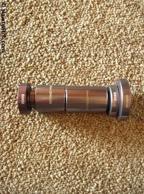 Next, I had to rebuild a new stack on both sides of the hub that would clear both ends of the axle. Similar to the removal process, I used the piloted 6902 adapters for my final pieces to hold everything together and keep it lined up straight.