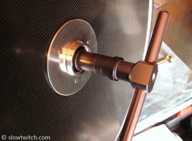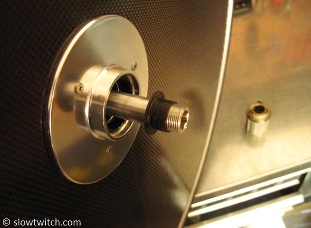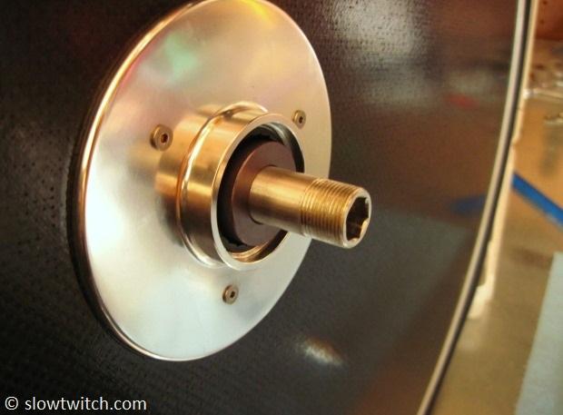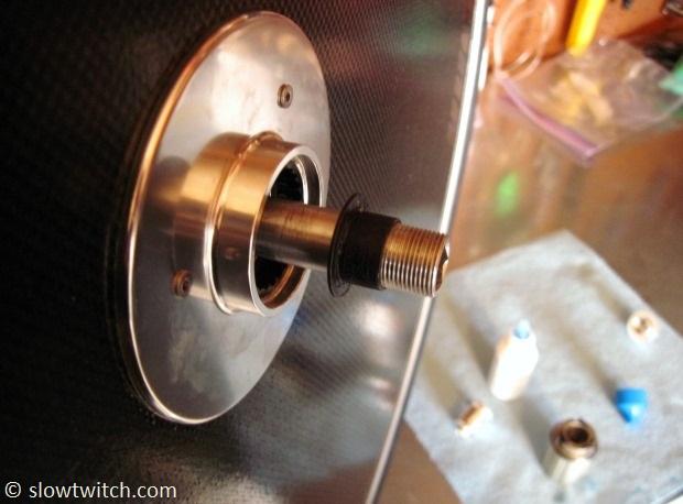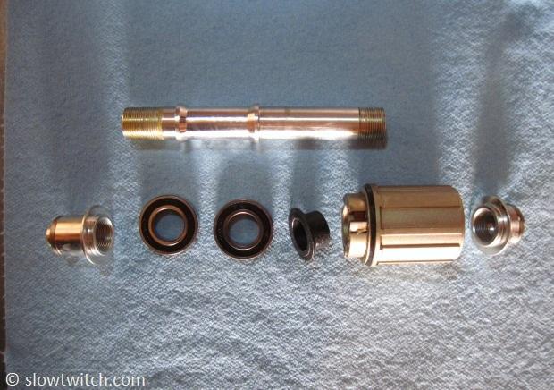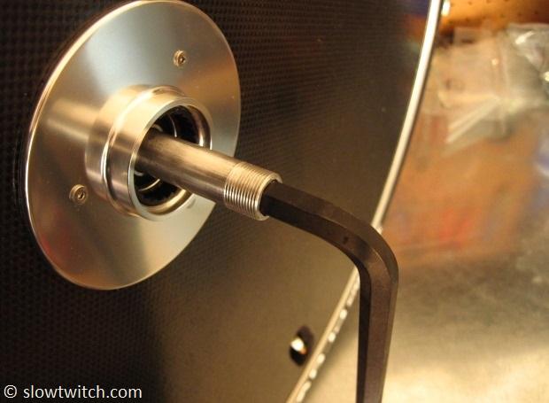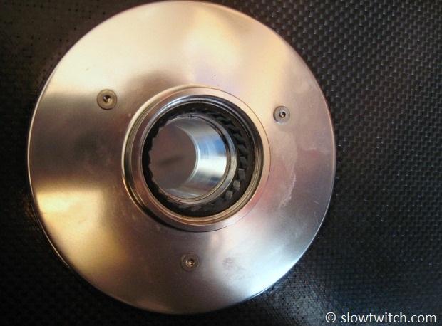 Note that the final piece (on bottom in the photo above) is a piloted 6902 adapter from my Wizard kit (not the over-axle kit). This keeps everything else in-line. The large piece (on top in the above photo) is a large 6904 bearing adapter, and perfectly fits the ratchet ring of the hub. When it’s all put together, it looks like this: