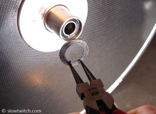Before you remove the left side bearing, you must remove the non-drive side c-clip. It is an internal snap ring with rubber coating, effectively making it a bearing seal. I don’t know the exact specs on this particular snap ring, but it looks to me like the two holes are about 1mm in diameter.