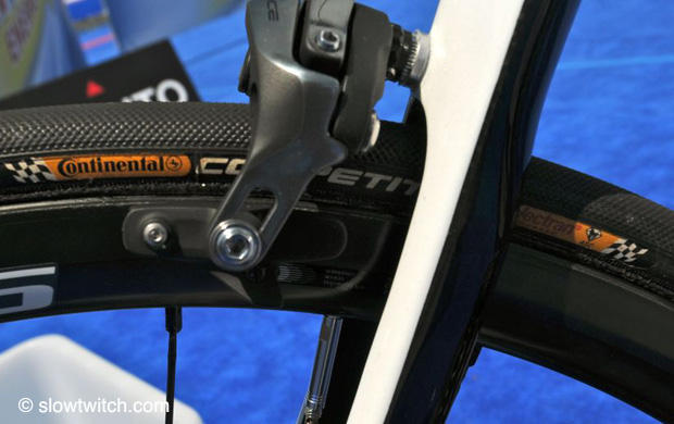 Shimano Dura-Ace brake calipers and Continental Sprinter tires.
