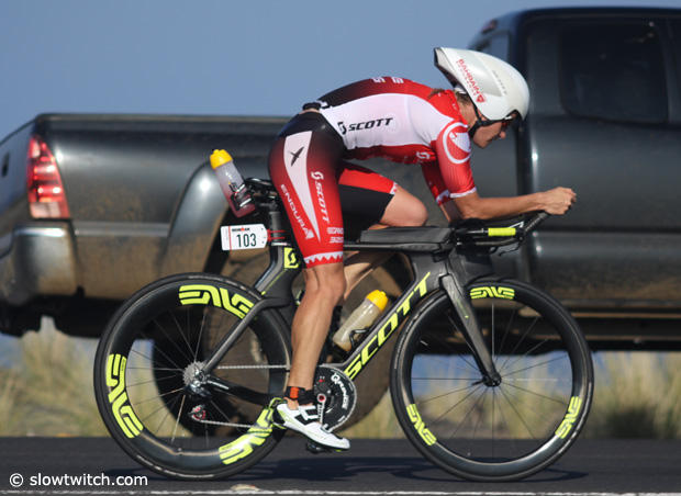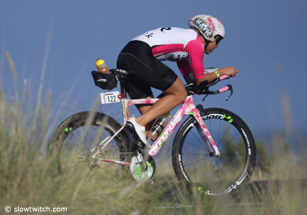A zipper delay in transition caused Rachel Joyce to miss the front group, and that meant riding most day alone. Her bike split ended up to be 5:01:29.