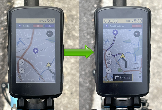 The idea is that you are out on a ride, and you want to detour to popular roads or paths. The heatmap data are projected on your map in the red highlighting. You can turn them on and off with a touch of the new little flame icon on the left side of the screen. If you want to route to an interesting looking road, you simply long-touch the screen and zoom and scroll as needed to position the blue pin icon on the road where you want to be. The Karoo 2 will do the routing as shown in the picture.