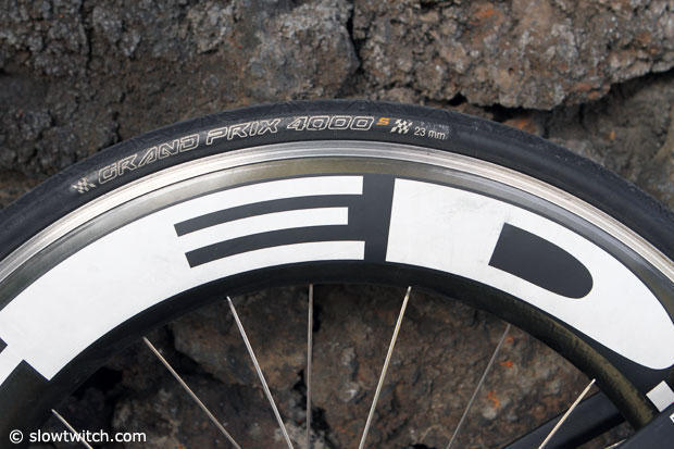 Hed Jet race wheels with Continental 23mm GP 4000 S tires in the back.