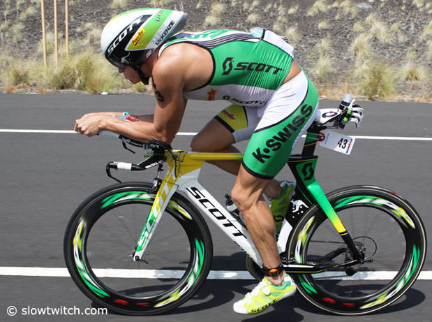 As McKenzie was leading, Pete Jacobs was working hard himself, putting in his Peak 20 Minute Power of the day of 317W (4.5 w/kg) and averaging 27.3 mph to catch up with McKenzie around mile 45. At this point Jacobs asserted his presence within the group, taking over with a 578W burst and jumping to the front. (Jacobs uses a Quarq power meter) He led for nearly 20 more minutes heading into the Hawi climb. However he was closely marked by Vanhoenacker and eventually Jacobs would fall back to let Vanhoenacker lead the group up the climb to Hawi. Jacobs and McKenzie stayed close to Marino during the 5-mile 480-foot climb, each averaging over 300W for about 18 minutes to keep up (4.4 w/kg for Jacobs, 4.2 w/kg for McKenzie). After the turn-around, 70.3 World Champion Sebastian Kienle passed the front group and soon led Vanhoenacker in a breakaway, establishing a 50-second lead over the group by mile 60. McKenzie dropped back from the lead, putting eventual third place winner Frederik Van Lierde and Jacobs towards the front of the chase pack.