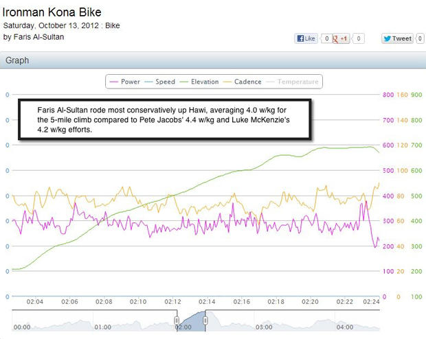 Throughout the race Faris Al-Sultan showed his experience on the Big Island and proved that he still had the ability to possibly repeat his 2005 victory. Comparing the three files between McKenzie, Jacobs and Al-Sultan we could assume Al-Sultan would have had the freshest legs since his SRM power meter shows he only spent 23 minutes above threshold, while Jacobs and McKenzie each spent over 45 minutes riding above threshold. On the climb to Hawi, Faris rode more conservatively, averaging 4 w/kg whereas and McKenzie rode 4.2 wk/g and Jacobs averaged 4.4 watts/kg.