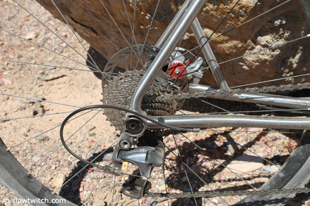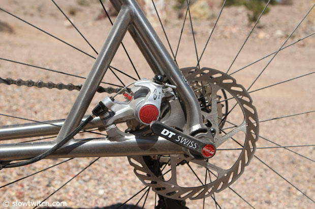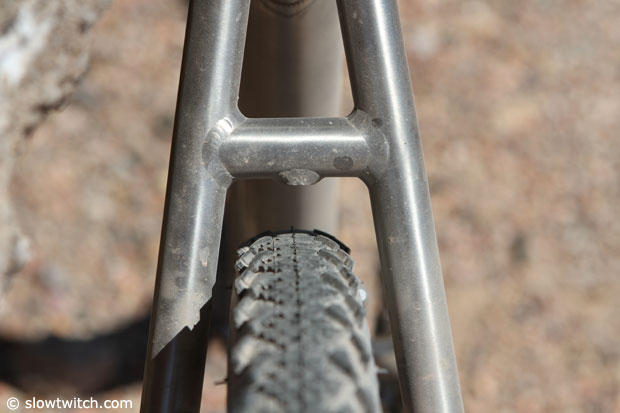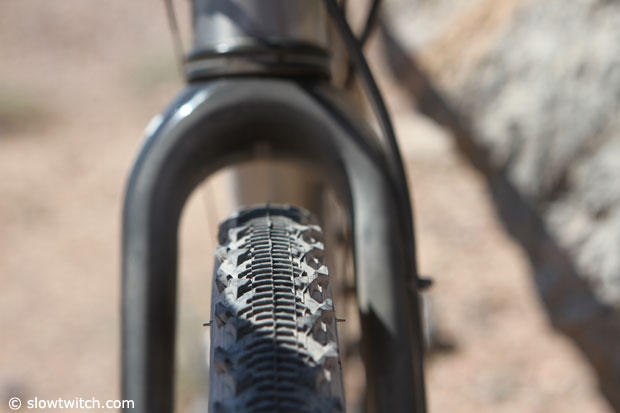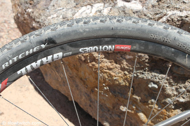 Stan's NoTubes ZTR Grail wheels with 32 mm Ritchey tires were on this one, but word has it that up to 40mm should work out.