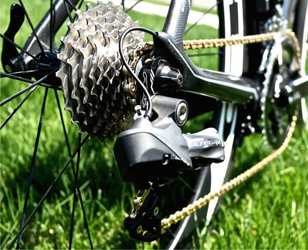 The ULtegra Di2 is fairly new as he first had this bike built with SRAM Red, but no regrets despite a a slight weight gain. The chain KMC.
