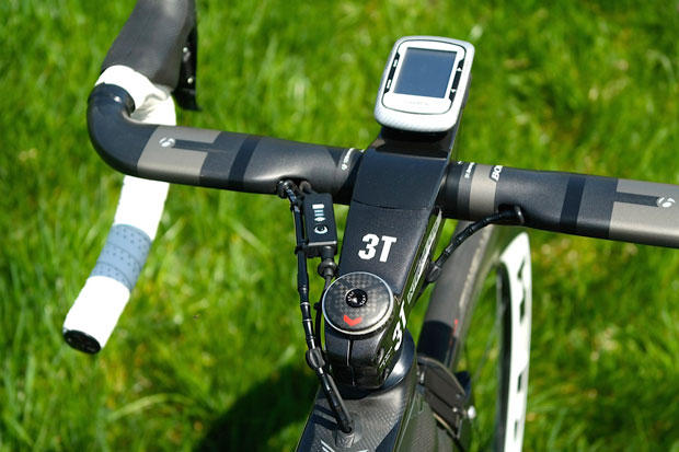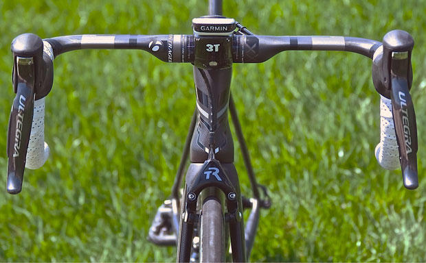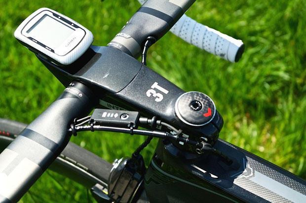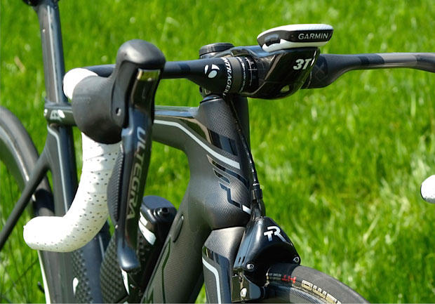 Looking down from the top you can see who nicely the junction box for the Di2 electronic shifting is cleverly placed behind the 38 cm wide Bontrager aero bars.
