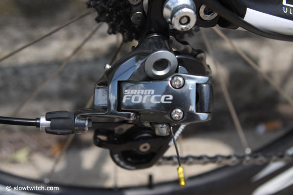 The 175mm SRAM Force crank arms have standard 53/39 rings and are matched to a 11-25 cassette in the back.