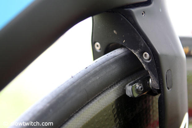 A look behind the forks show the integrated brakes.