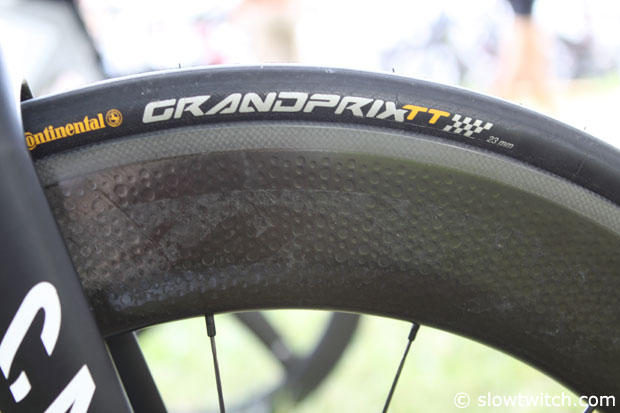 Markus Fachbach rides a Zipp 808 Firecrest wheel up front with a 23mm Continental GrandPrix TT tire.