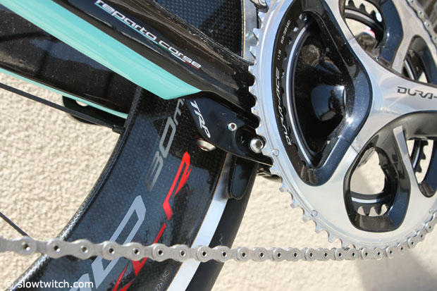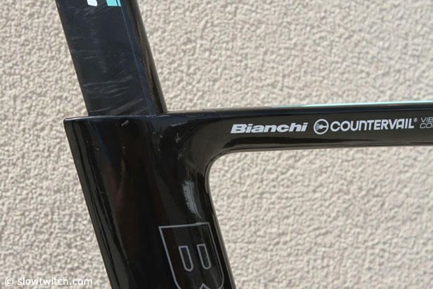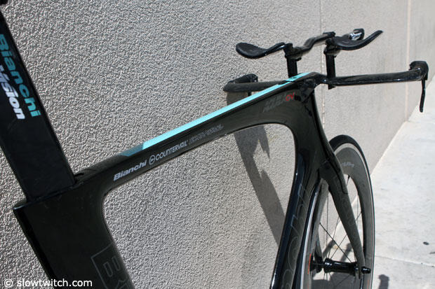 At the 2014 Interbike show we moved the Bianchi Aquila CV bike to the side to capture detailed pics of this bike that is still considered a prototype. Word has it that currently there are only a hand full of these frames. CV stands for countervail.