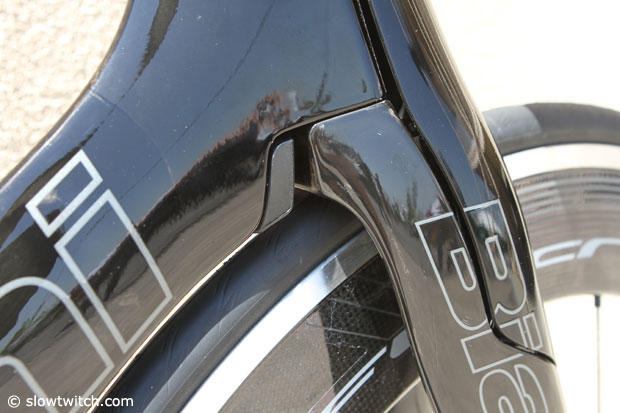 A cover on the headtube hides the TRP integrated brakes and assorted cables plus the Junction A box.