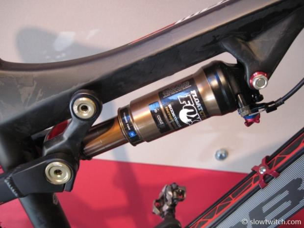 The rear suspension has a pivot around the rear axle, designed to isolate braking forces from the rest of the suspension. This new Fox rear shock is also said to be highly adjustable for any trail condition.