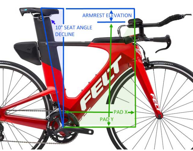 To just double check I took the rider’s saddle height (736mm) and I took the cosine of the angle between verticality and the seat angle (about 80 degrees of seat angle means that angle formed is about 10 degrees), and that gave me a rise of 725mm from the BB, and if you subtract 52mm from that you get 673mm of Pad Y, which is pretty darned close to the 677mm the fitter measured. So, the fitter’s measures support each other (inside the allowable margin of noise you typically find in bike fitting equipment and equations).