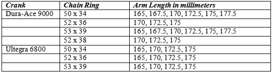 Chainring sizes: 50/34, 52/36, 52/38, 53/39