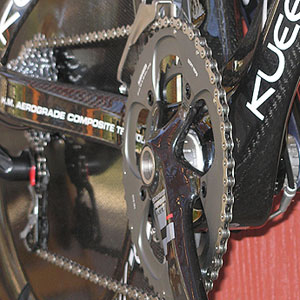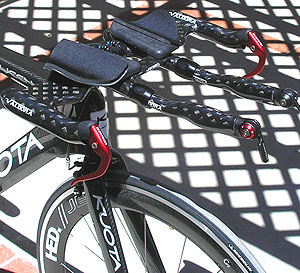 That pair of 1cm headset spacers, plus a zero degree stem in place of the -17 degree stem, got me my elevation. But I must tell you that this bar is probably a better spec on a Cervelo P2C, or frames with taller head tubes, such as Cannondale's Slice and Scott's Plasma. Not that I'm complaining: 2cm of spacers isn't huge. In fact, let's take Jordan Rapp's position as an example. He rides with a slightly taller saddle than do I, by about 2cm. He rides with 19cm of drop, compared to my 15cm. Do the math, take the 2cm of spacers out from under the stem of this Kueen K I just built and, presto, the bike fits him perfectly.