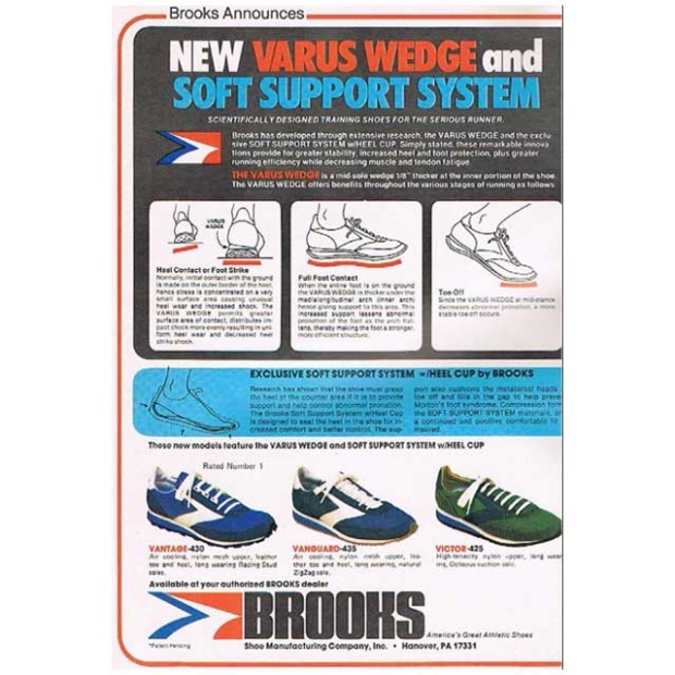 The small company Brooks noticed that some runners (many actually) had unstable heels. As this foot rolled through impact, the heel would cave to the inside, which would cause the foot to toe off at an sub-optimal angle. It was believed then that this was one of the causes of the injuries that were occurring. In 1976 Brooks introduced the Vantage (highest pic above), advertising soft support. They showed pictures of a compromised heel and a supported heel (see the ad just above). The foam was still sheet EVA and the solution was the Varus Wedge. That shoe won awards in the magazines and a new category of shoe emerged. It wasn’t called Stability yet, but this recognized shoe category was coming. Brooks used that Varus Wedge construction for more than 10 years. Not long afterward every brand had its version of supportive construction.
