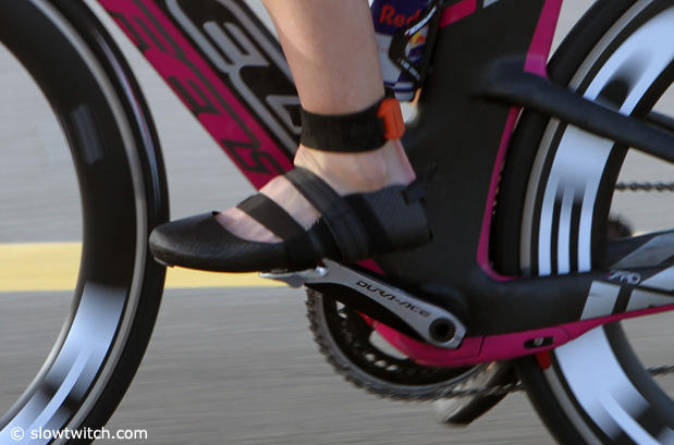The shoes were crafted and designed by Götz Heine of biomac in Germany and Daniela Ryf is not the first pro to have asked Götz Heine to make custom shoes. Paula Newby-Fraser and Daniela Riesler are among those who have been riding with mid-sole mounted cleats. The Erlkönin model featured just below however is brand new, and only Ryf has a pair of those.