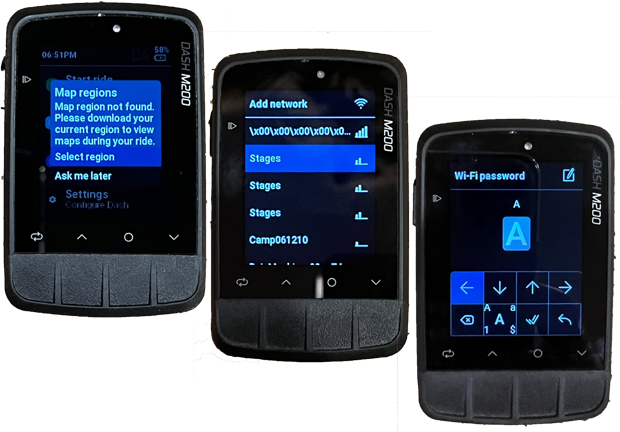 The setup starts with pairing the Dash to the Stages Cycling app by scanning the QR code. After it does its initial connection and syncing, the screen on the Dash pops up a message that Map regions are not found and you need to download them. Ignore this on the Dash. (This is where I messed up the first time and finished setup on the M200.) Just keep going in the mobile app to connect to Wi-Fi, select the maps to download to the device, configure your profile data pages (more on that later), and update your user profile and preferences. After that, connect to your Bluetooth or ANT+ devices on the Dash and you can go out for a ride.
