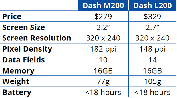 The two units are nearly identical except for size. The “L” is for large and has a larger battery and full-color 2.7” screen. The M is medium with a color 2.2” display. The L200 can display up to 12 data fields and the M200 can display up to 10 data fields on one page. Prices are $279 USD for the Dash M200 and $329 USD for the L200.