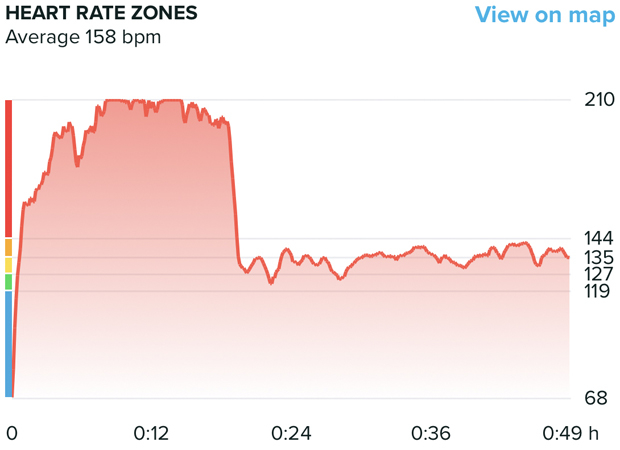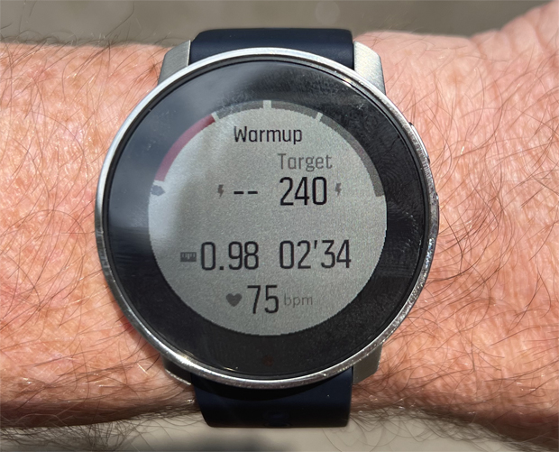 Heart rate was the only feature that did not perform perfectly for me. When it was good, it matched my other comparison devices (wrist HR on another watch & external HRM). But it would occasionally lose track and peg against what looked like the watch’s upper limit. I just had to remember to tighten the wrist band one notch more than my typical setting, and all was good. The picture below shows a run where I started and then remembered part way in that I forgot to tighten the band. As soon as I did, presto, HR was perfect for the rest of the workout.