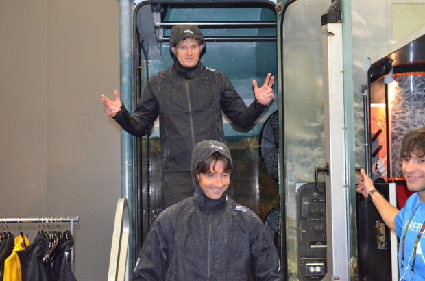 Lars Finanger and Brandon Marsh test out gear in the Gore Tex storm chamber.