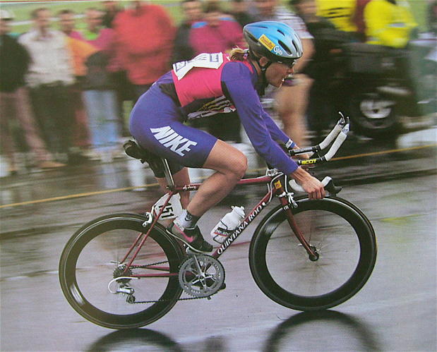 I got so tired of hearing the made-up, factless lies about 650c wheels I bought one of my sponsored duathletes (Liz Downing, below) a USCF racing license, took her to a 40k time trial, where she raced her first, last and only bicycle race of her life. She broke the existing women’s national record by a minute-and-a-half. On a bike with 650c wheels.