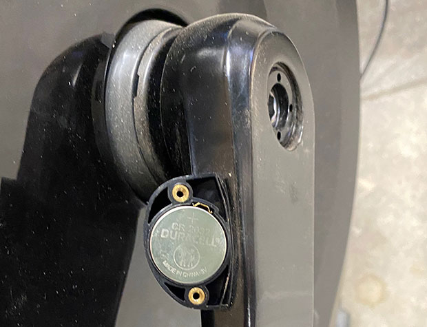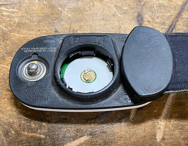 I likewise looked at the battery contact on a Wahoo TICKR heart rate monitor (you’ll see what the contact looks like in the pic above), and on a Stages power meter (which I have on the Stages SB20 Smart Bike in my studio). In each case, as you see, the contact occurs on or near the center of the battery, not near the perimeter. The Stages contact is below.