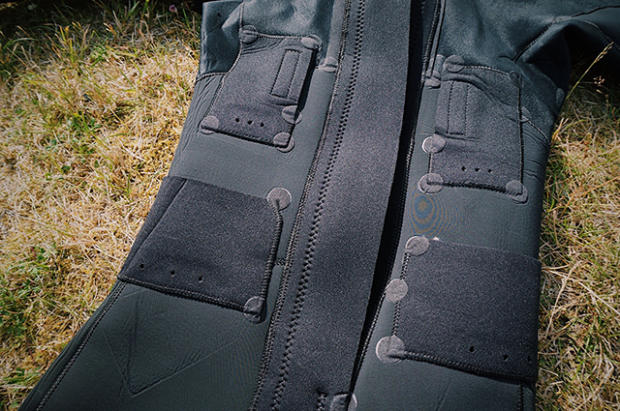 Four storage compartments can be found inside the front of the suit. They are designed to hold nutrition supplies or mandatory equipment such as emergency medical gear. Completely filled-up they can limit the upper-body flexibly while swimming. Stored sensibly they are very helpful and allow independence from the official aid stations. The pocket design is well thought out as minor holes on the bottom allow water to flow out fast.