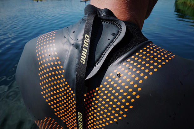There is a never ending discussion among Swimrunners. The typical zip on the back of the suit is well known from triathlon and open water suits. During lengthier run sections competitors like to have the option to pull down their suit to not overheat. For some athletes this procedure is easier carried out while using the zip on the rear and the one on the front. Nevertheless an additional zip adds weight and the process of opening and closing the suit costs energy during a competition. The very stretchy neoprene of the SR02 suit permits stress-free removing of the suit without the use of the rear zip. The lively debate among Swimrunners will consequently continue and it undoubtedly is a very individual preference.