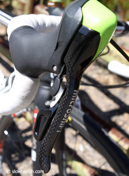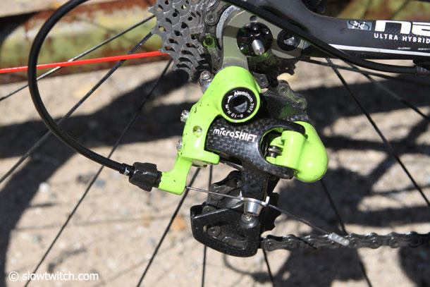 The MicroSHIFT Carbon Arsis rear derailleur is not very common in the Pro field.