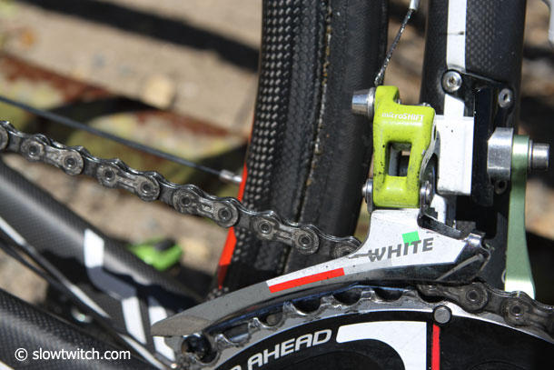 A MicroSHIFT front derailleur and a K-Edge chain guard.