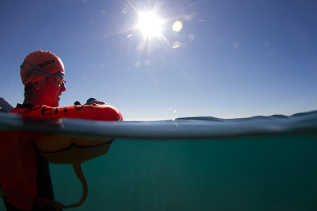 Here Åsa Lundström is resting on the safety buoy before getting started with the next swim session.